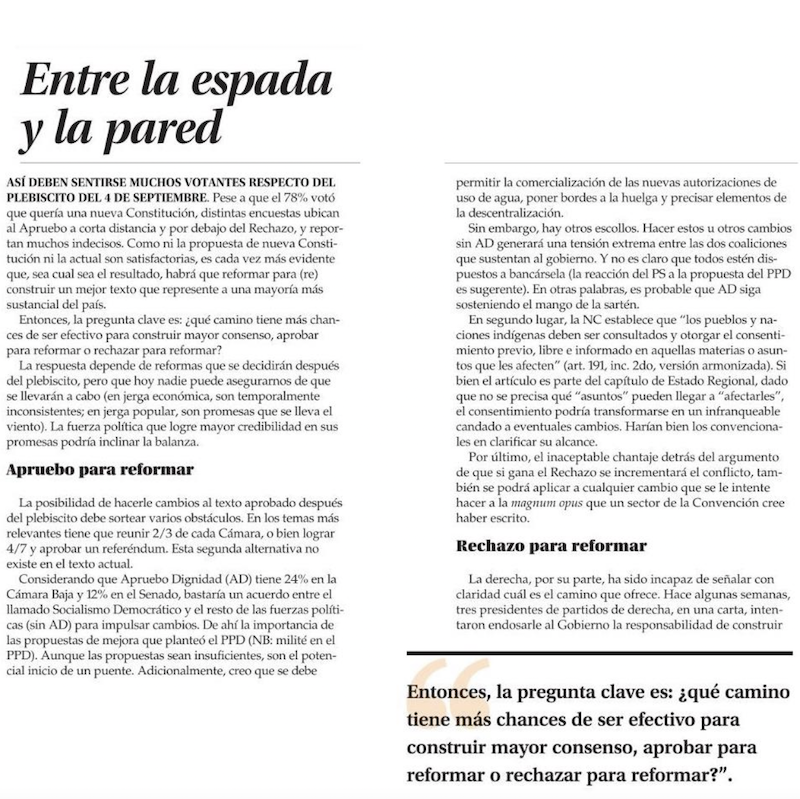 “Así deben sentirse muchos votantes respecto del plebiscito del 4 de septiembre”, comienza la columna que el académico de la Escuela de Gobierno UC, Rodrigo Valdés, publicó en El Mercurio. En ella, destaca que como ni la propuesta de nueva Constitución ni la actual son satisfactorias, es cada vez más evidente que, sea cual sea el resultado, habrá que reformar para (re) construir un mejor texto que represente a una mayoría más sustancial del país.