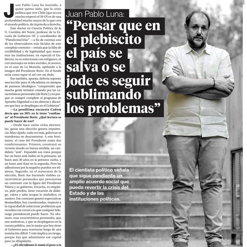En entrevista con La Segunda, el profesor de la Escuela de Gobierno UC, Juan Pablo Luna, habló sobre la crisis política que está viviendo el país, la que, según asegura, es mayor de la que cree el mundo político, de izquierda a derecha.