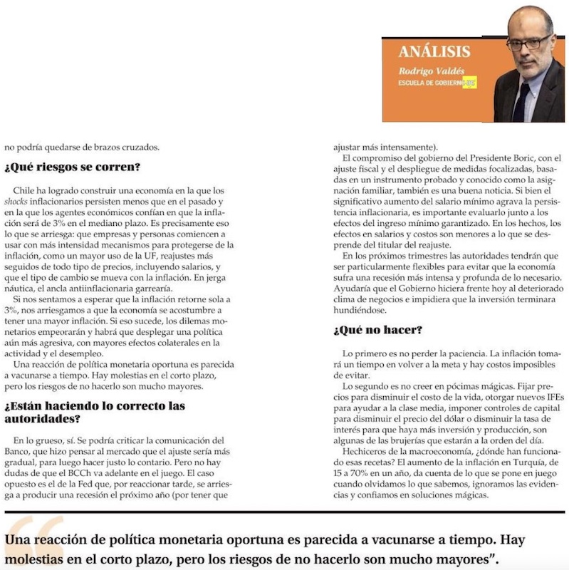 En una columna publicada en El Mercurio, el subdirector de la Escuela de Gobierno UC, Rodrigo Valdés, habla sobre la inflación que desde hace más de 30 años que no se presentaba en el país. Por lo que el aumento en los precios se ha convertido en uno de los temas de mayor preocupación en las personas junto con la delincuencia.