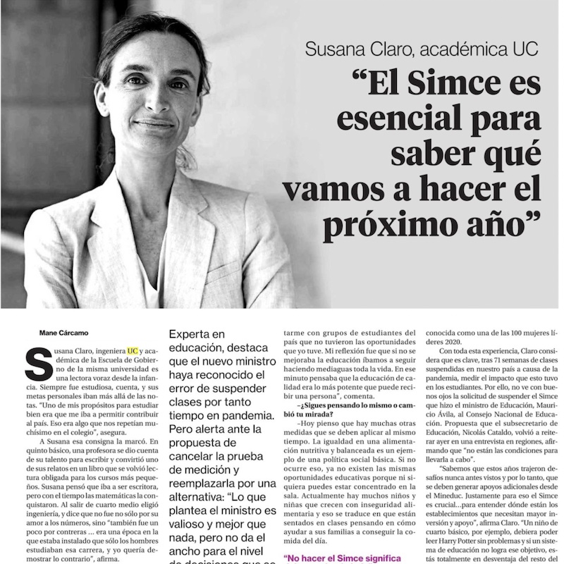 En una entrevista con el diario La Segunda, la académica de la Escuela de Gobierno UC, Susana Claro, destacó que “el Simce es esencial para saber qué vamos a hacer el próximo año”, en relación con la propuesta de cancelar la prueba de medición y reemplazarla por una alternativa.
