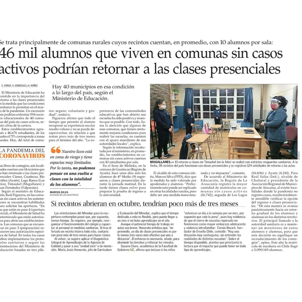 Respecto a la posibilidad de volver a clases presenciales, diversos expertos/as analizan en el diario El Mercurio aquella posibilidad y de cómo ha funcionado en comunas rurales del país. Opina la profesora Susana Claro.