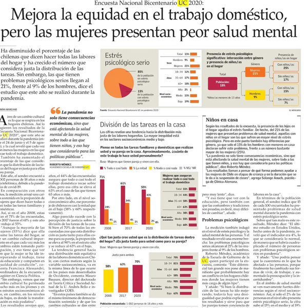 Encuesta Bicentenario en El Mercurio. Ante la dificultad crecería la confianza y la solidaridad. Resultados que arroja esta medición anual de la Universidad Católica. Roberto Méndez señala “si la gente no tiene expectativas, los conflictos se hacen más grandes”.