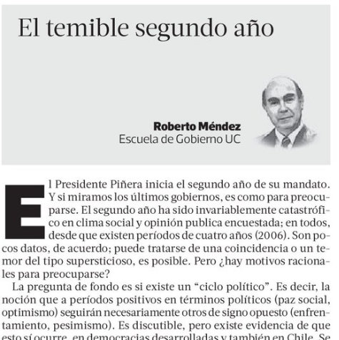 El profesor Roberto Méndez adelanta lo que podría ser el segundo año de gobierno de Sebastián Piñera, en su columna de diario La Tercera.