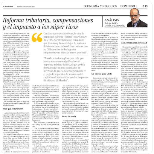 Rodrigo Valdés comienza el año 2019 planteando sus puntos sobre la eminente Reforma Tributaria en el diario El Mercurio. A quién se debiese cobrar más impuestos capital y bajo qué condiciones es lo que plantea en este texto.