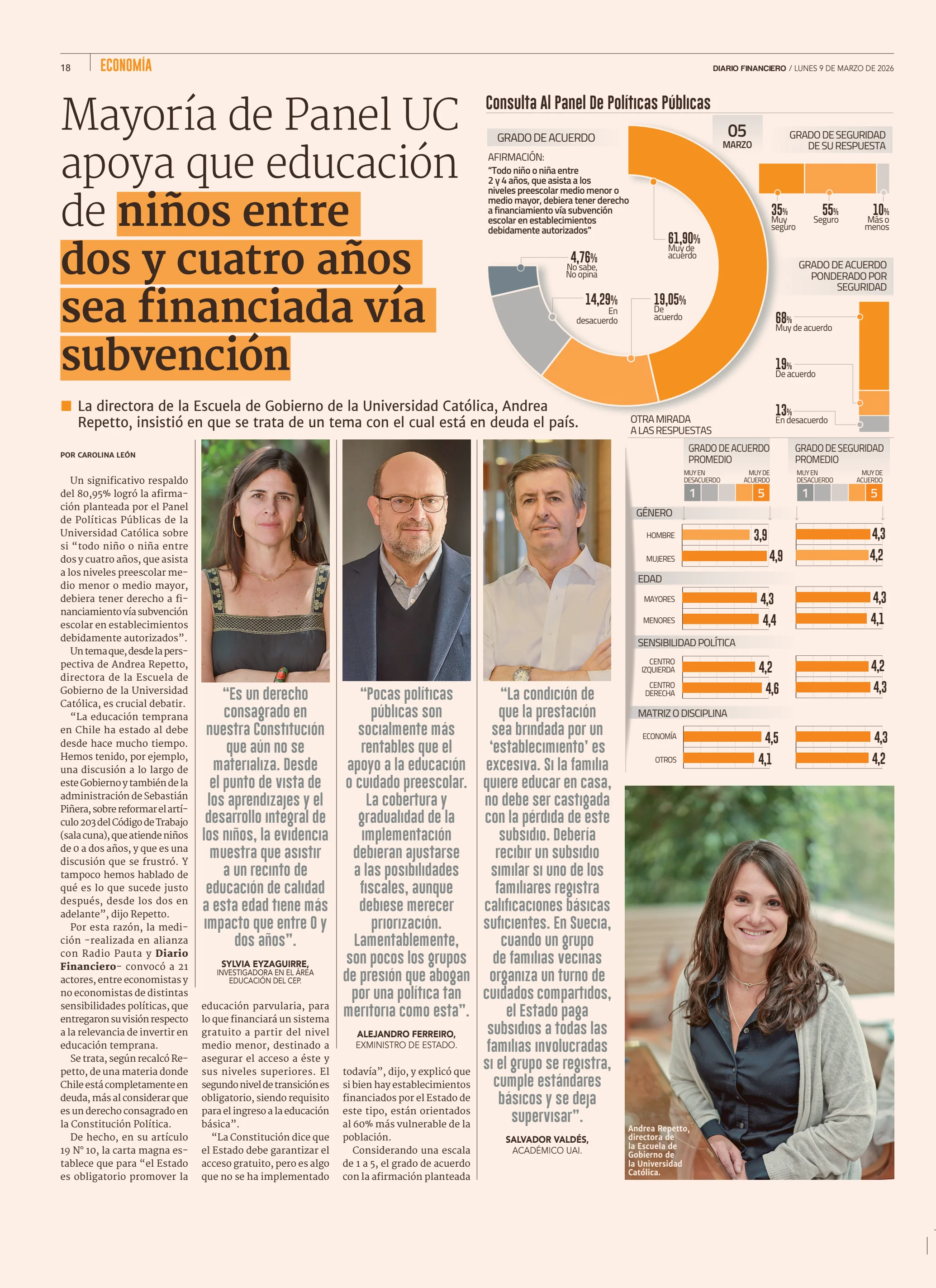 La directora de la Escuela de Gobierno conversó con diario Financiero respecto a los resultados del Panel UC. En esa linea, Andrea Repetto también enfatiza en que el derecho a la educación parvularia -así como lo plantearon algunos panelistas- está garantizado en la Constitución.