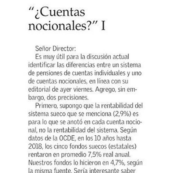 Profesor Rodrigo Valdés escribe carta a El Mercurio para precisar con respecto a las diferencias en un sistema de pensiones entre cuentas individuales y nocionales.