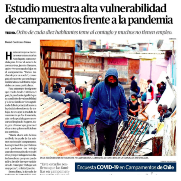 El Mercurio de Antofagasta muestra el estudio realizado por Techo Chile y Escuela de Gobierno sobre la realidad de los campamentos en el contexto de la pandemia.