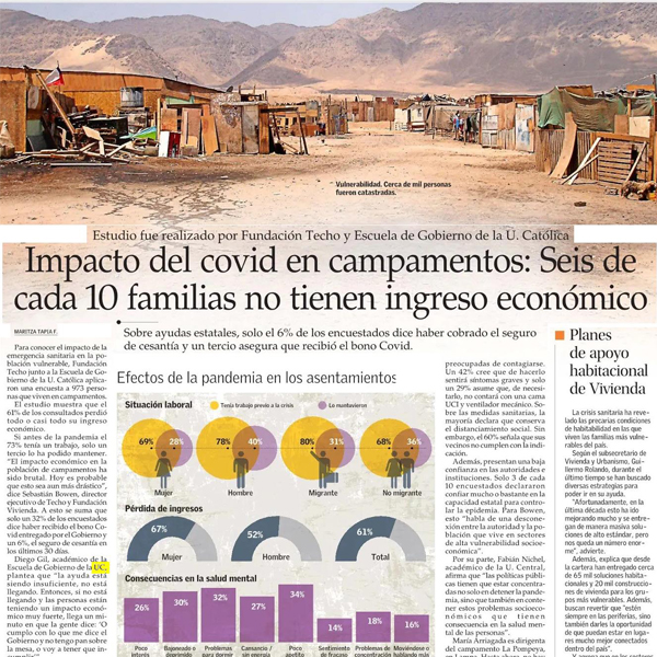 Primer estudio en Chile sobre pandemia COVID-19 en campamentos, realizado entre Techo-Chile y la Escuela de Gobierno UC. Impacto en ingresos y pérdida de trabajo, baja sensación de seguridad sanitaria, entre otros, son parte de estos relevantes resultados. Participaron los profesores Eduardo Undurraga y Diego Gil.