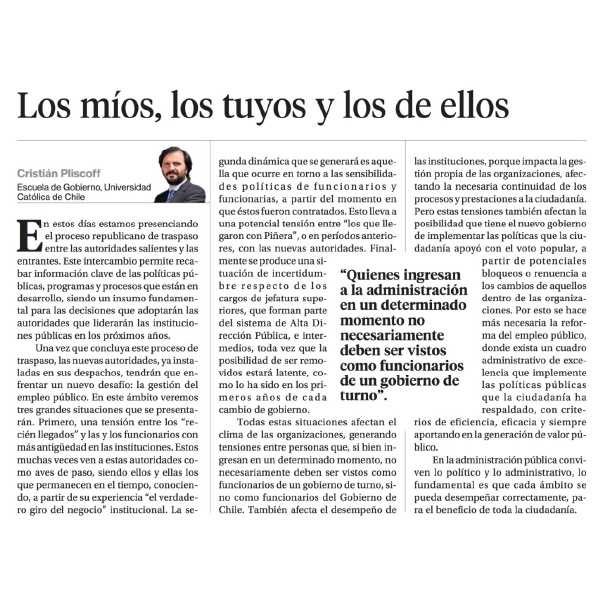 El director de la carrera de Administración Pública de la Escuela de Gobierno UC, Cristian Pliscoff, habló en columna de La Segunda de hoy sobre la relevancia del traspaso entre las autoridades salientes y de quienes serán parte del gobierno de Gabriel Boric.