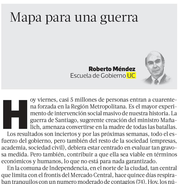 A las 22 horas del viernes 15 de mayo cerca de 5 millones de personas estraron en cuarentena en la Región Metropolitana. El profesor Robert Méndez lo visualiza como el “mayor experimento de intervención social masivo de nuestra historia” en esta columna en el diario La Tercera. Lo importante, dice, es evaluar su viabilidad.