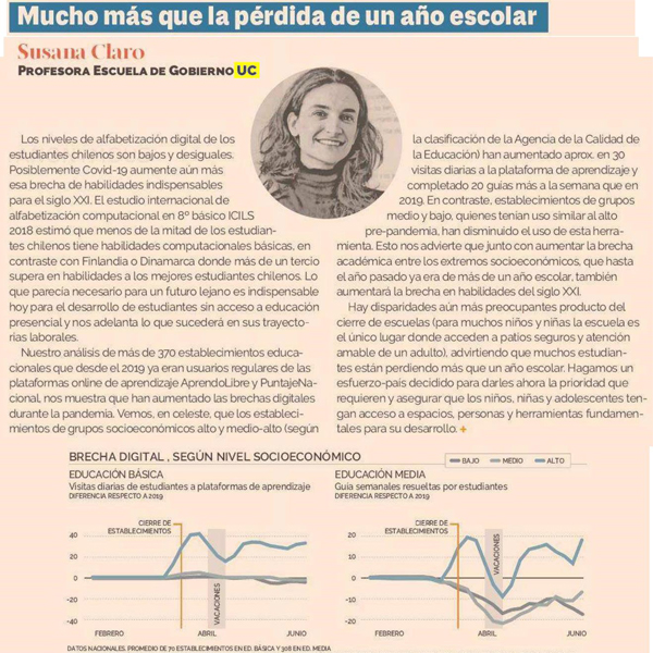 Alfabetización digital en niños y niñas chilenos/as: son desiguales. Así lo refleja los datos recientes de la profesora Susana Claro Aumento de esta brecha sería aún más producto de la pandemia. Lee la columna que escribió la profesora en Diario Financiero.