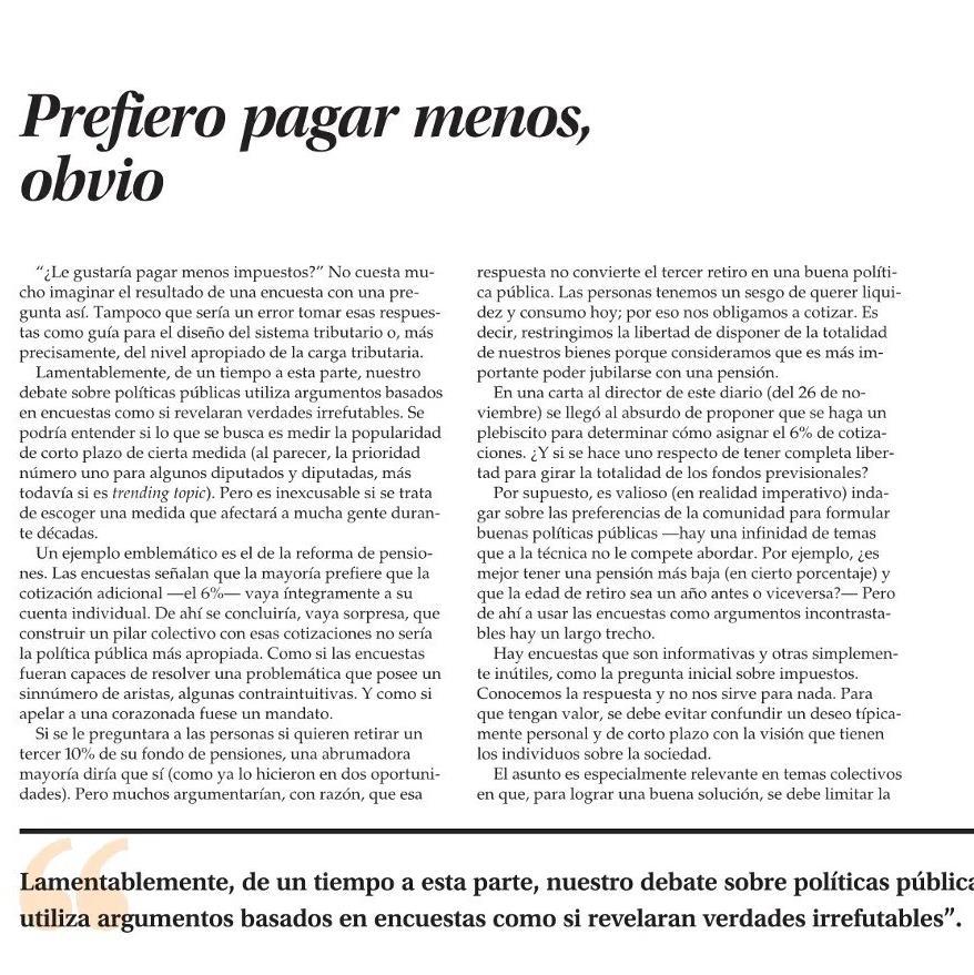 El rol de las encuestas y políticas públicas, Rodrigo Valdés en El Mercurio “Es valioso (en realidad imperativo) indagar sobre las preferencias de la comunidad (…). Pero de ahí a usar las encuestas como argumentos incontestables hay un largo trecho”.