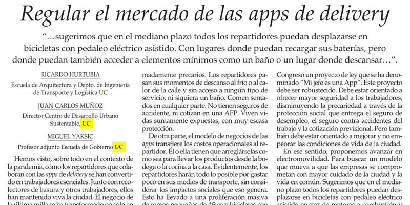 Ante la visibilización y demanda por servicios delivery, el profesor de la escuela de Gobierno UC, Miguel Yaksic, junto a Ricardo Hurtubia y Juan Carlos Muñoz de Cedeus e Ingeniería UC, manifiestan en el diario El Mercurio la idea de robustecer el proyecto “Mi jefe es una App”, para transferir costos de protección social a App y proteger a repartidores.
