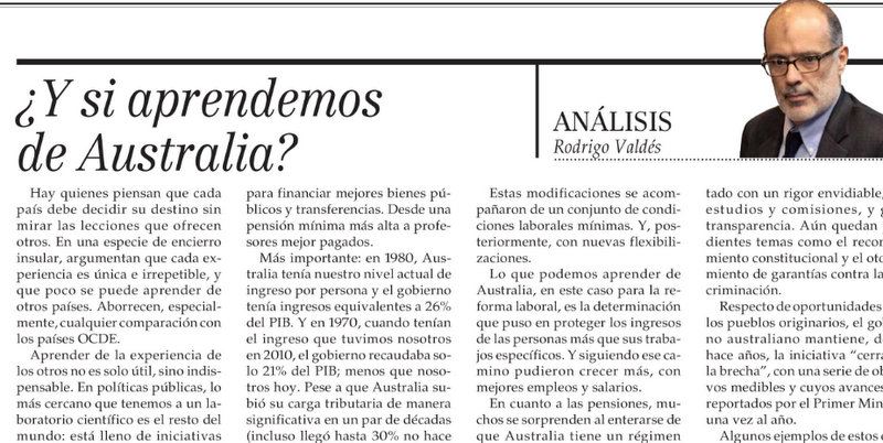Debo al parecido que tendría nuestro país con Australia, el profesor Rodrigo Valdés explora en su columna en el diario El Mercurio sobre los elementos que debiese considerar Chile a la hora de pensar en convertirse en un país desarrollado, mirando a la exitosa economía australiana.
