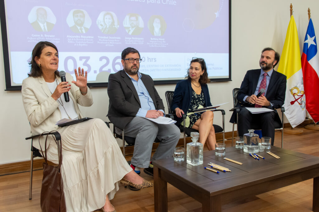 El encuentro contó con la participación del académico de la Universidad de Georgia, Gene A. Brewer, reconocido especialista en gestión pública y desempeño estatal, junto a un panel integrado por Bettina Horst, consejera del Consejo de Alta Dirección Pública, Trinidad Inostroza, presidenta del Consejo Asesor Presidencial en Modernización del Estado y Jorge Rodríguez, investigador del Centro de Estudios Públicos (CEP). La conversación fue moderada por Cristian Pliscoff, director de la carrera de Administración Pública UC.